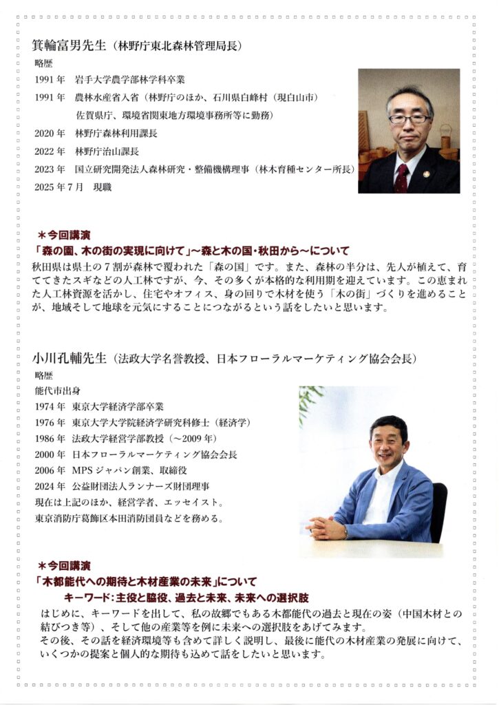 二つ目は、能代市出身の経済学者であり、エッセイストの小川孔輔氏の講演。木都能代の過去と現在、そして未来に向け、能代の木材産業発展の提案をしてくださるとのこと。